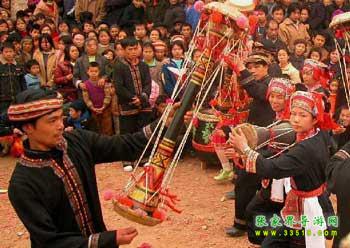 仗鼓舞是張家界市桑植縣白族獨(dú)有的一種民族舞蹈。 仗鼓舞以“仗鼓”作道具,與朝鮮族鼓舞有異曲同工之妙。 鼓長1.2米,兩頭大如碗口, 用皮革繃面, 中細(xì)可握,形如木杵。相傳南宋末天寶年間,有谷、王、鐘三姓兄弟在蒙將兀良合臺“寸白軍”服役,后“寸白軍”被遣散,三人即從云南大理流落至桑植定居。某年臘月,白族兄弟們正在打糍粑準(zhǔn)備過年,一幫官兵突然圍寨抓人,白族人即用粑粑杵奮起反擊,將官兵打敗,白族人為慶賀這一仗的勝利,就以木杵作道具跳舞作樂,這便是仗鼓舞的由來。后來,白族人將粑粑杵改成鼓,配以笛子、嗩吶、大號和鑼、鈸、罄等鳴樂伴奏,同時創(chuàng)造了八十一套舞蹈動作,成為一種獨(dú)具風(fēng)格的民間舞蹈。