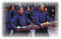 指著圓符,不久,蒙面者便神魂入定;似有神附體,慢慢地全身抖動起來,手舞足蹈,這就是已“進(jìn)入陰間”。據(jù)傳過陰之人,雖蒙頭蓋面,也能辨別方向,隨法師的指使行事,陰間之事能有問必答,人們所要了解之事,也都從他們那里得到答復(fù),并可以探求禳解之法。法師用法術(shù)指使他們?nèi)プ龈鳂邮虑?。到一定時間,法師用咒語報他們招回,他們在法師的指示下,陸續(xù)返回陽世清醒過來。若有個別不能返回,法師則加倍對他們施法,用刀指向他,并念咒畫符,強(qiáng)令返回。過陰之人蘇醒后,法師揭開頭蓋,這時個個面色慘白,目光遲鈍,如害一場大病。法師再施以復(fù)原之術(shù),使之慢慢復(fù)原。他們復(fù)原后,完全忘記陰間的事情。