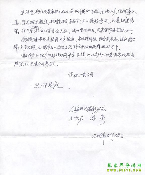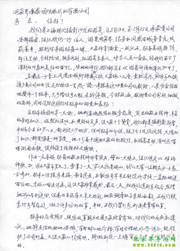 2009年5月19日“上海現(xiàn)代攝影沙龍”一行16人,參加張家界旅游導(dǎo)游網(wǎng)組織的張家界旅游跟團,于2009年5月25日結(jié)束行程。游玩期間,由于導(dǎo)游楊蓓的出色講解和周到的服務(wù),得到客人的一致好評。客人特寄表揚信一封,如下: