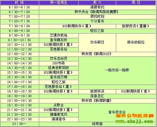 張家界旅游交通頻道茲定于四月八號(hào)試播,頻率為FM93.2兆赫和103.2兆赫。頻道以立足旅游交通、服務(wù)百姓大眾為宗旨,設(shè)置了《清晨有約》、《順風(fēng)時(shí)刻》、《932新聞快報(bào)》、《輕松之旅》、《交通你我他》、《百姓服務(wù)站》、《歡樂(lè)總動(dòng)員》和《音樂(lè)隨車聽(tīng)》等欄目。屆時(shí),聽(tīng)眾可以通過(guò)熱線電話、短信平臺(tái)以及網(wǎng)絡(luò)廣播等多種途徑參與到電臺(tái)節(jié)目中來(lái),在第一時(shí)間了解新聞動(dòng)態(tài),掌握市場(chǎng)信息,享受娛樂(lè)休閑。